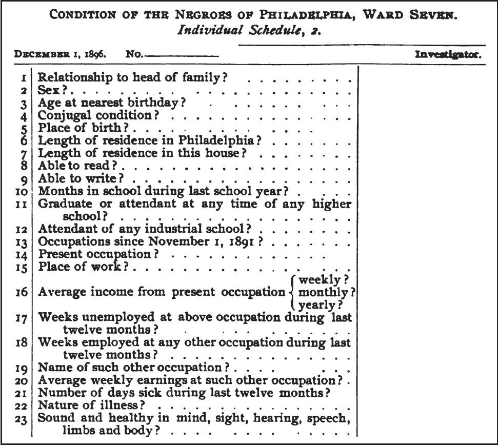 Rather than relying on extant criminological databases that were formatted (that is, designed both conceptually and technically) in ways that would invisibly reproduce extant racial hierarchy, Du Bois and his team sought to build different data formats. These alternative formats opened up the possibility of different kinds of data than had hitherto existed. Those different data formats more clearly highlighted the social causes of treatment (in contrast to the biological tendencies of traits) that were resulting in inequalities.