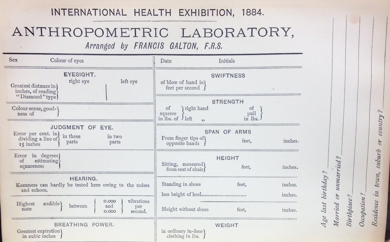 One paradigmatic deployment of Galton’s forms were in his anthropometic labs. The first such lab was set up at London’s International Health Exhibit in South Kensington in 1884 where attendees paying threepence could walk through the laboratory, a 6-foot by 36-foot “long narrow enclosure,” to take a series of tests measuring such powers as eyesight, reaction time, span of arms, force of blow, and so on (Galton 1908, 245). The seemingly simple idea of giving a person a series of tests of bodily and perceptual ability assumed a new meaning once experts, scientists, and cranks of all kinds began recording those results on standardized printed forms. Galton reported that at the Health Exhibition alone “the number of persons measured in the laboratory . . . was no less than 9,337, and each of them in 17 different ways” (1885, 206). Each of them left with their own copy of the just produced record of themselves as recorded on a printed blank form.