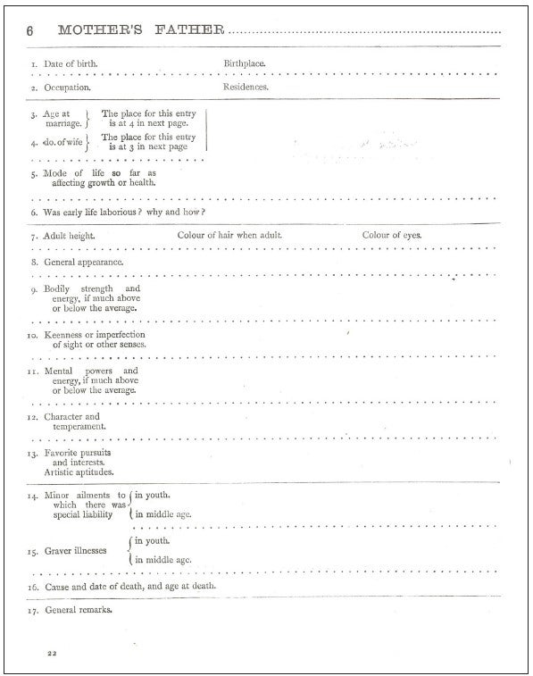 The blank form was further solidified as a key technology in his construction of an analytical science of the data of heredity through his publishing in 1884 of Record of Family Faculties, Consisting of Tabular Forms and Directions for Entering Data with an Explanatory Preface. The book is essentially a data collection machine consisting of some 50 pages of printed blank forms on which a form-filler would write the names of their ancestors (Galton 1884, 14), then children (Galton 1884, 15), and then describe in detail each of the known family members in terms of vital information (birthdate, birthplace), bodily measures (height, hair color, “general appearance”), mental measures (“mental powers and energy”, eyesight), notes on “character and temperament,” and finally medical information regarding ailments, major illnesses, and causes of death (Galton1884, 16–60). It was a book of printed blanks in which one would give an account of something presumed important about oneself. It was a series of predefined boxes into which one fit oneself, one’s spouse, one’s children, and one’s parents.